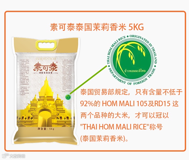 素可泰泰国茉莉香米(金装)5kg采用泰国茉莉香米原装进口,一年一季的生长周期,让大米生长更加饱满,米粒更清香,上市以来广受消费者欢迎。