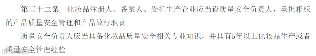 此前,生产企业都已根据《化妆品生产许可检查要点》(行业俗称105条)设立了“质量负责人”,承担的相当于是“质量安全负责人”的责任,所以对于大部分生产企业而言影响并不大。