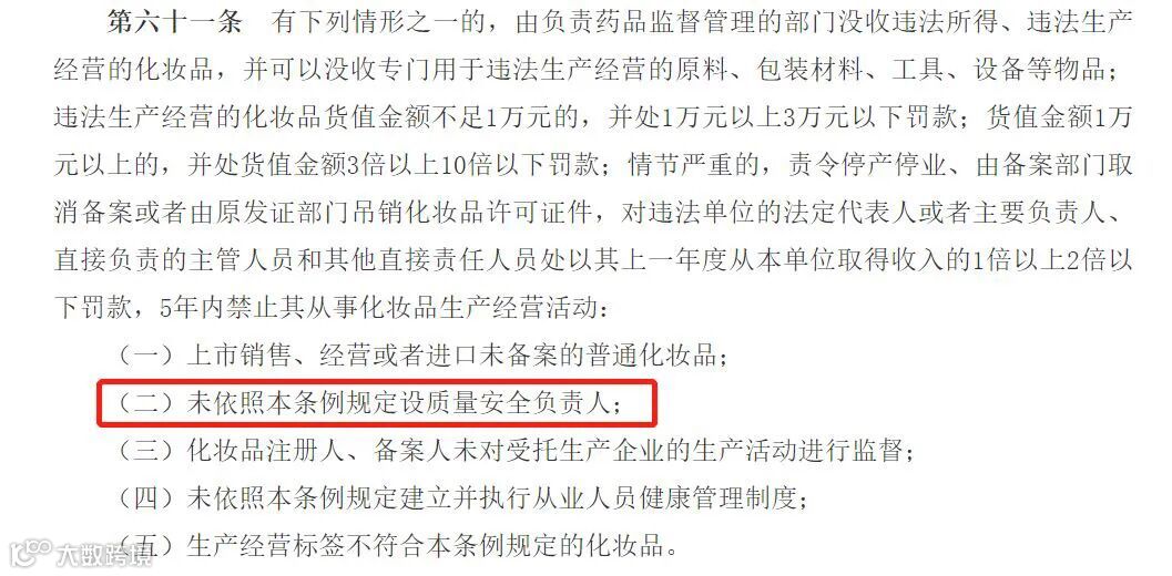 已于1月1日起正式实施的《化妆品监督管理条例》(以下简称新条例)规定,化妆品注册人、备案人、受托生产企业应当设置质量安全负责人,未依照规定设置,将面临罚款、停产停业、吊销许可证,甚至5年内禁止从事化妆品行业的处罚。