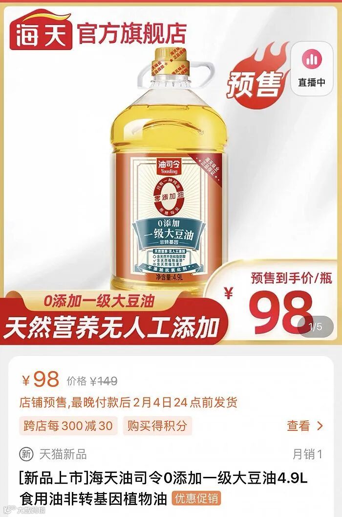 近日其天猫旗舰店上线了新的食用油品牌“油司令”,有玉米胚芽油和一级大豆油两款产品,4.9L装的售价均为98元。