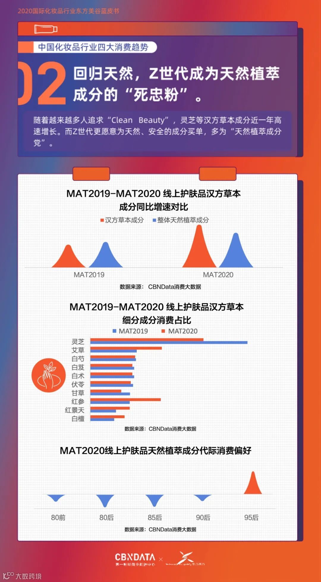 在对健康安全问题更为聚焦的当下,“不含有害物质、零伤害、无毒”的Clean Beauty被更多人接受。同时,中国消费者更愿意为天然植萃成分买单。《报告》数据显示,线上天然植萃成分占4成以上,为护肤品首选成分,以灵芝、艾草为代表的汉方草本增速较高,领涨整体天然植萃成分增长。而在消费者代际层面,Z世代呈现出显著的消费偏好,可谓天然植萃成分的忠实粉丝。