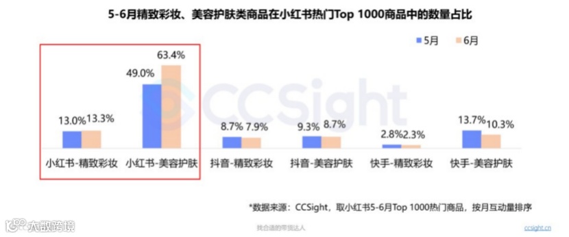 根据CCsight数据显示,在小红书上,精致彩妆、美容护肤商品数量占比超高,美容护肤类商品在抖音上更受欢迎。
