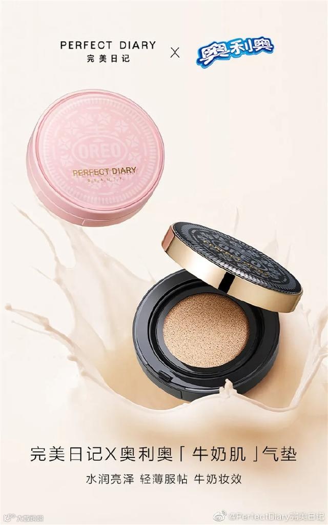 奥利奥这个贯穿Z世代消费者的童年和成年记忆中的饼干,外观和口感,品牌好感度均受年轻人喜爱的热门单品,也成为美妆品牌联名的心选品牌。今年3月完美日记携手奥利奥推出了全新包装的饼干“牛奶肌”气垫,该气垫以奥利奥饼干原型为灵感,将饼干上的花纹纹印在气垫之上。