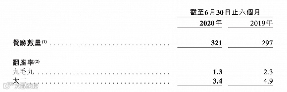 半年报披露,疫情导致的餐厅暂时运营和客流量减少,使得餐厅营运收入同比减少35.8%至7.18亿元;同时翻座率也有所减少,其中九毛九餐厅翻台率下降至1.3次/天,太二的也下滑至3.4次/天。