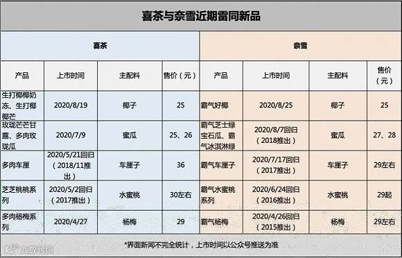 喜茶和奈雪の茶(以下简称“奈雪”)再一次发布了雷同的新品。