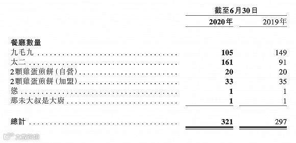 为减轻疫情对公司业务运营的影响,九毛九称在上半年共关闭了48家自营餐厅(包括43间九毛九餐厅、2间太二餐厅及3间2颗鸡蛋煎饼自营餐厅),并且表示不再在广东省和海南省以外经营九毛九餐厅,关闭餐厅而出售资产产生亏损约达到2780万元。截至目前,九毛九共运营321家餐厅,其中太二数量最多,达到161家。