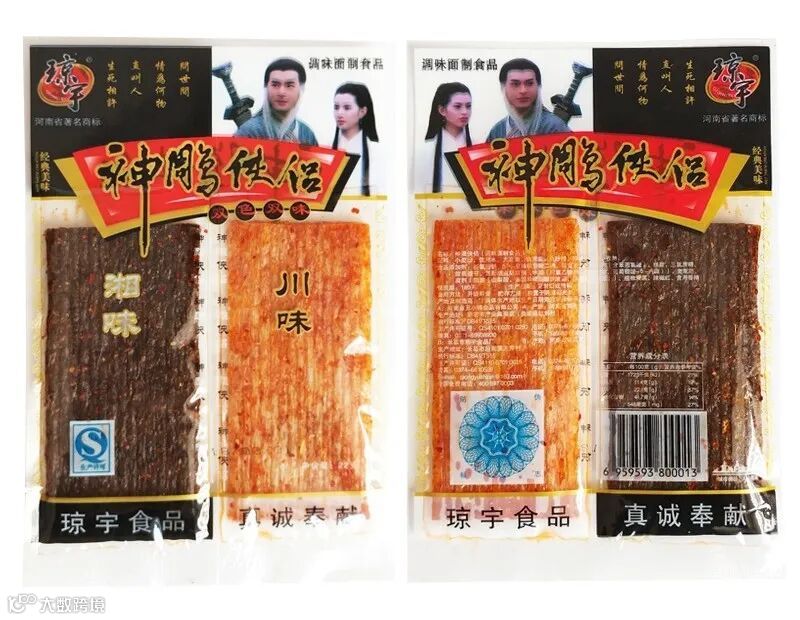 这类辣条名字的特点是,紧跟潮流,什么火就叫什么。其中被跟最紧的当数国内外流行的影视剧,这些影视剧不仅可以看,还可以被“吃”。比如大长筋(今)、回家的诱惑、神雕侠侣、黄奇隆蜘蛛侠、花千骨、来自星星的你、爱情公寓……