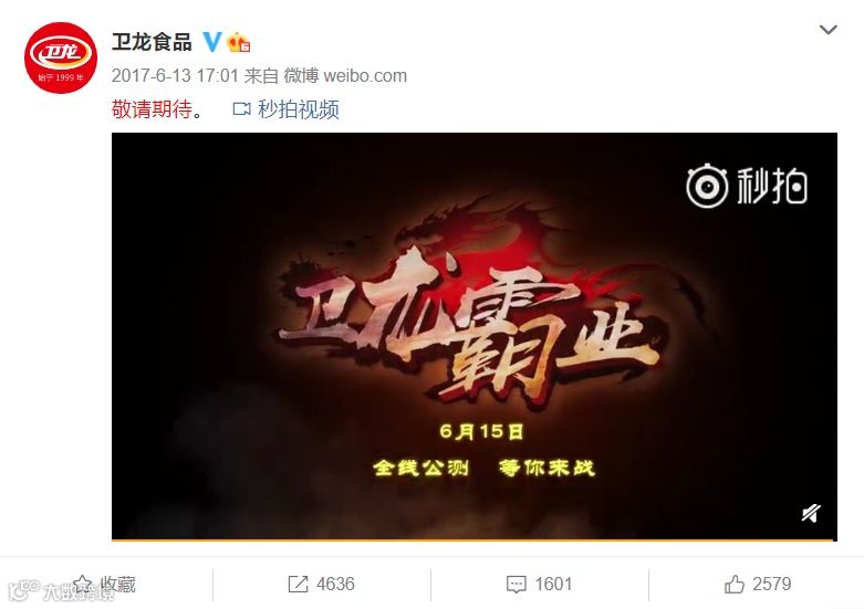 2017年6月13日,卫龙在官微发布了一段45秒的视频,跨界做手游《卫龙霸业》,宣称15日开启全民公测,并配文“敬请期待”。