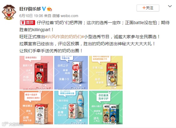 除了日常生活能用到的IP素材之外,旺仔也爱“蹭”时事热点,制作话题,比如最近《乘风破浪的姐姐》很火,旺仔就模仿做起“兴风作浪的奶奶们“奶界选秀,把自家品牌各种各样的奶拉来正面battle,引起众多网友Pick。