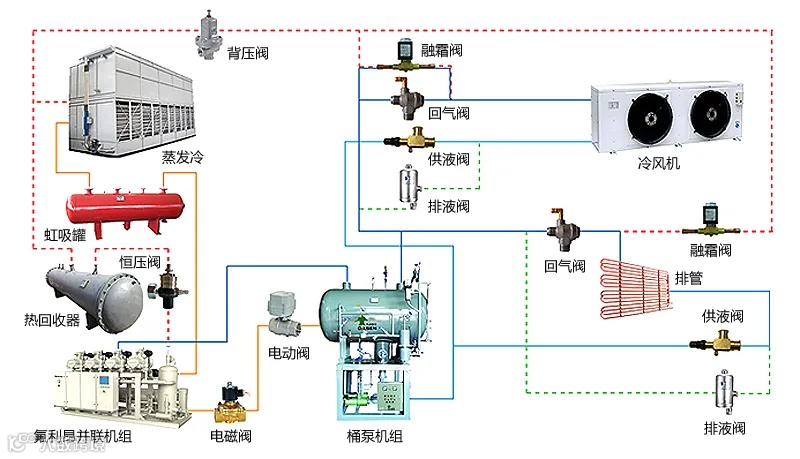冷库实际上是一种低温联合起来的冷气设备,冷库(冷藏库)也属于制冷设备的一种与冰箱想比较,其制冷面积要大很多,但它们有相通的制冷原理。