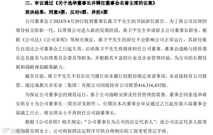 在当天召开的董事会上,天齐锂业董事会收到蒋卫平递交的书面辞任报告,为了将上市公司治理的领导权交给新一代,以带领天齐锂业进入新的发展阶段,蒋卫平申请辞去上市公司董事长职务。