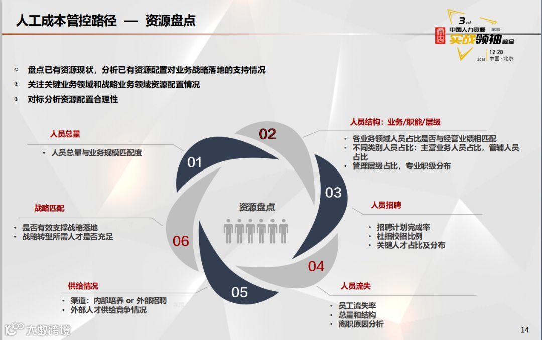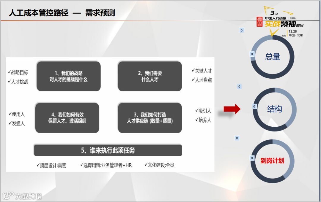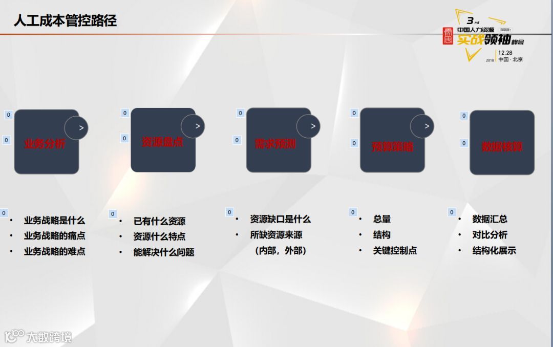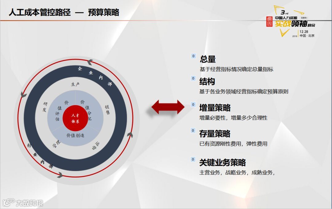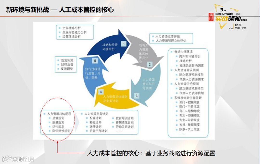 我们如何在企业里把资源配置工作做好,如何通过资源配置最大化支撑企业发展,以及如何把当下非常急迫的战略转型工作有效地落地,总结了人工成本管控工作的五个环节:
