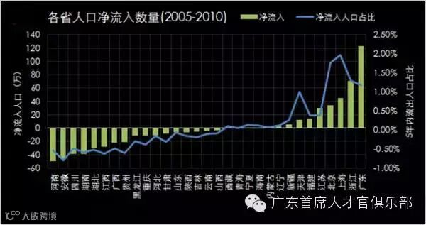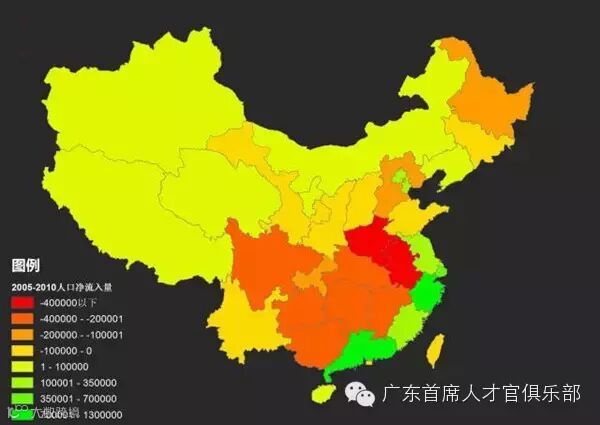 从上图中可以清楚地看到,大半个中国的人口,以省为单位来观察的话,全都在净流出,而少数净流入的地区,则集中分布在东南沿海和北京天津两地。