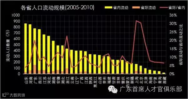 从2005年到2010年各省流动人口规模上来看,在各自省内流动的人口比例占了全国人口流动总量的大头。大部分省级单元的省级流动比例均低于10%。也就是说,全国的人口流动性基本上被封闭在省一级的单元当中。而能够产生较大规模(大于10%)跨省人口流动,大概只有这六个地区:北京、上海、天津、浙江、广东、福建。
