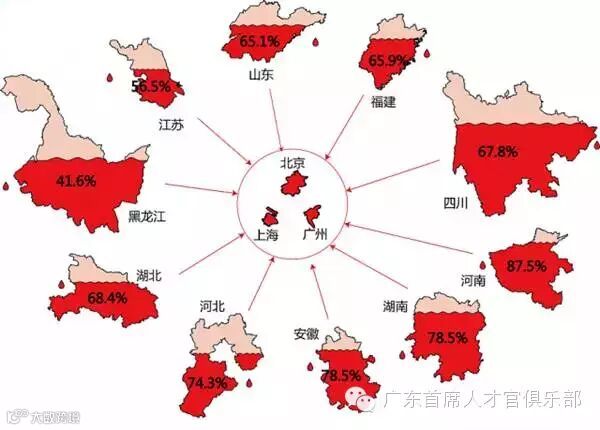 当然,这只是这些省份被北上广抽血后的情景。其实这些省份本身也有不少抽血大省,比如江苏。它虽然被上海抽掉不少,但是它还能从临近的安徽河南等地补回来一些。总体而言,假如考虑全国情况,这张图里有些省份的血量会变得更低。