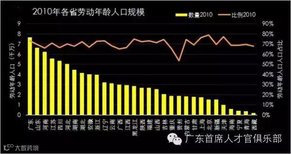 通过第六次人口普查数据可以看到:2010年,虽然我国各省级单元(省、自治区、直辖市)劳动年龄人口(可以简单地理解为劳动力)的总量各异,但其劳动年龄人口比例都处于60%~80%的区间(除贵州以外)。像北京上海天津这种直辖市,其比例甚至达到70%~80%的区间。