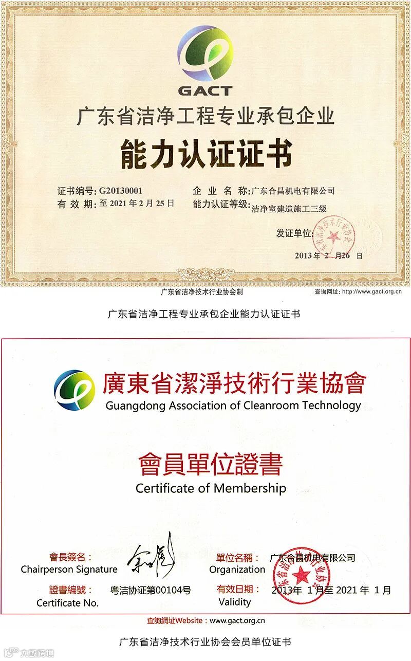 为什么选择广东合昌?因为我们资质齐全,获得广东省洁净工程专业承包企业能力认证,省洁净技术行业协会会员单位;