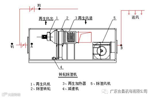 一是利用除湿转轮在除湿同时处理空气有升温的功能,二是在零度以下时转轮除湿机组仍能确保一定的除湿量,以区别于冷冻升温除湿在零度以下由于蒸发器结冰结霜而导致的除湿效能低下并不能连续除湿的不足之处。