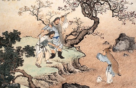 郯子,春秋时期人。父母年老,患眼疾,需饮鹿乳疗治。他便披鹿皮进入深山,钻进鹿群中,挤取鹿乳,供奉双亲。一次取乳时,看见猎人正要射杀一只麂鹿,郯子急忙掀起鹿皮现身走出,将挤取鹿乳为双亲医病的实情告知猎人,猎人敬他孝顺,以鹿乳相赠,护送他出山。