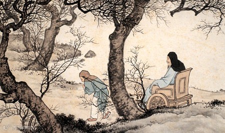 丁兰,相传为东汉时期河内(今河南黄河北)人,幼年父母双亡,他经常思念父母的养育之恩,于是用木头刻成双亲的雕像,事之如生,凡事均和木像商议,每日三餐敬过双亲后自己方才食用,出门前一定禀告,回家后一定面见,从不懈怠。久之,其妻对木像便不太恭敬了,竟好奇地用针刺木像的手指,而木像的手指居然有血流出。丁兰回家见木像眼中垂泪,问知实情,遂将妻子休弃。