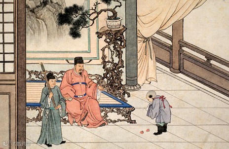 郭巨,晋代隆虑(今河南林县)人,一说河内温县(今河南温县西南)人,原本家道殷实。父亲死后,他把家产分作两份,给了两个弟弟,自己独取母亲供养,对母极孝。后家境逐渐贫困,妻子生一男孩,郭巨担心,养这个孩子,必然影响供养母亲,遂和妻子商议:“儿子可以再有,母亲死了不能复活,不如埋掉儿子,节省些粮食供养母亲。”当他们挖坑时,在地下二尺处忽见一坛黄金,上书“天赐郭巨,官不得取,民不得夺”。夫妻得到黄金,回家孝敬母亲,并得以兼养孩子。