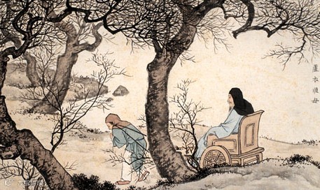 闵损,字子骞,春秋时期鲁国人,孔子的弟子,在孔门中以德行与颜渊并称。孔子曾赞扬他说:“孝哉,闵子骞!”(《论语·先进》)。他生母早死,父亲娶了后妻,又生了两个儿子。继母经常虐待他,冬天,两个弟弟穿着用棉花做的冬衣,却给他穿用芦花做的“棉衣”。一天,父亲出门,闵损牵车时因寒冷打颤,将绳子掉落地上,遭到父亲的斥责和鞭打,芦花随着打破的衣缝飞了出来,父亲方知闵损受到虐待。父亲返回家,要休逐后妻。闵损跪求父亲饶恕继母,说:“留下母亲只是我一个人受冷,休了母亲三个孩子都要挨冻。”父亲十分感动,就依了他。继母听说,悔恨知错,从此对待他如亲子。
