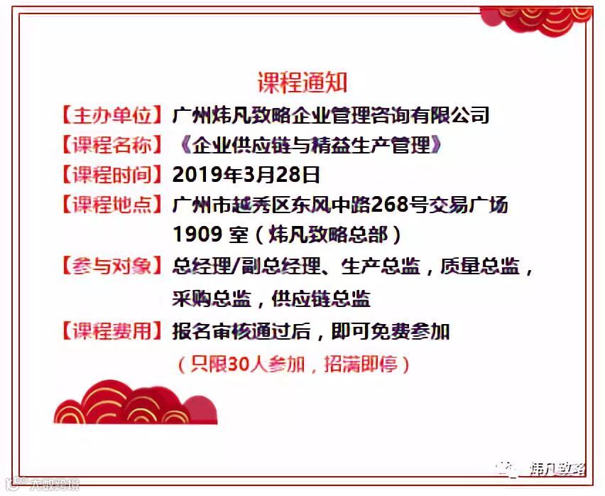 2019年3月28日炜凡商学院邀请到炜凡致略合伙人:周劲雄和梁海涛两位导师为中小民营企业带来为期1天的《供应链管理绩效改善提升》和《精益生产及六西格玛质量管理》两节课程。