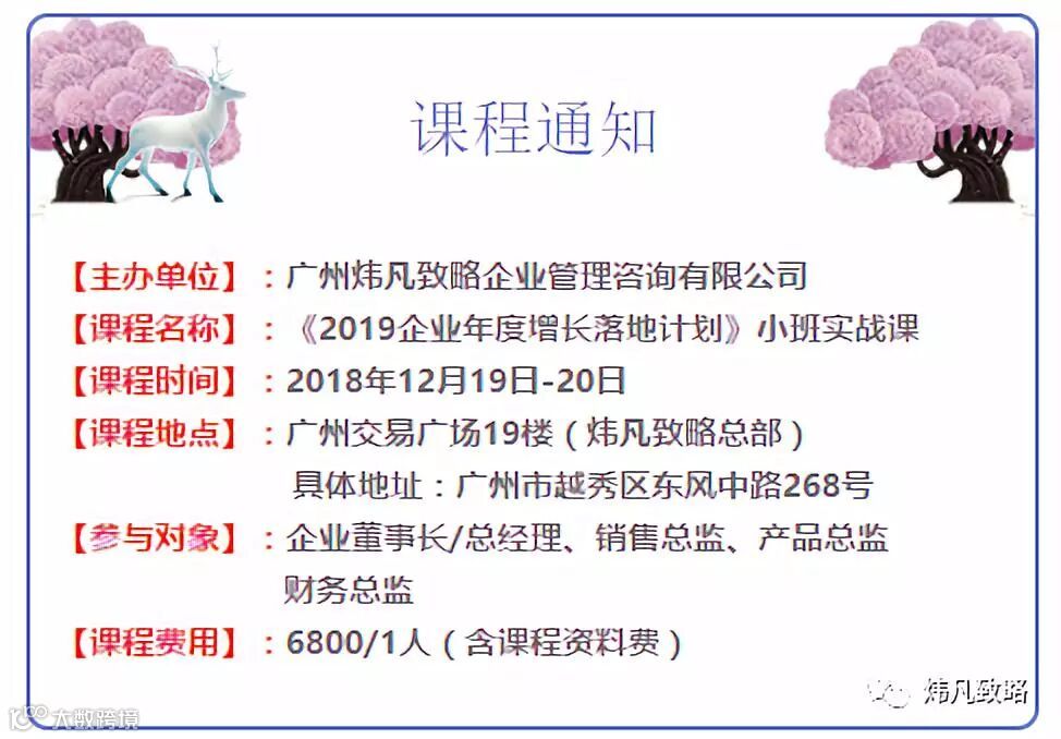 2018年12月19-20日,炜凡致略特邀您参加重磅打造的《2019 企业年度增长落地计划》小班实战课。