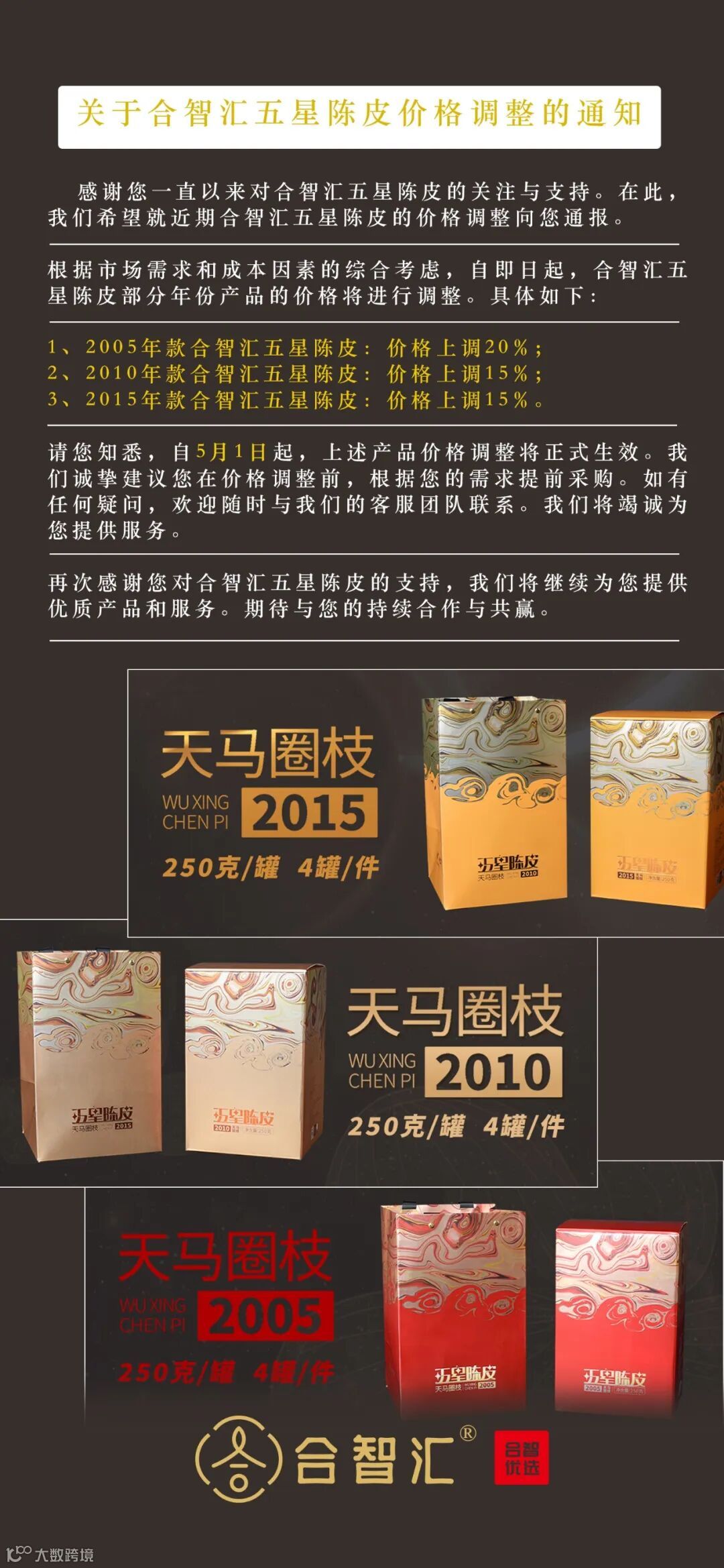 感谢您一直以来对合智汇五星陈皮的关注与支持。在此,我们希望就近期合智汇五星陈皮的价格调整向您通报。