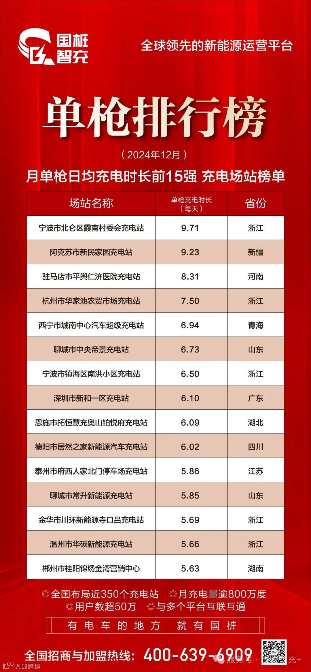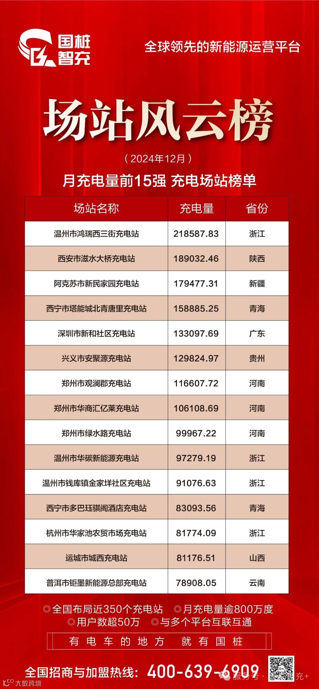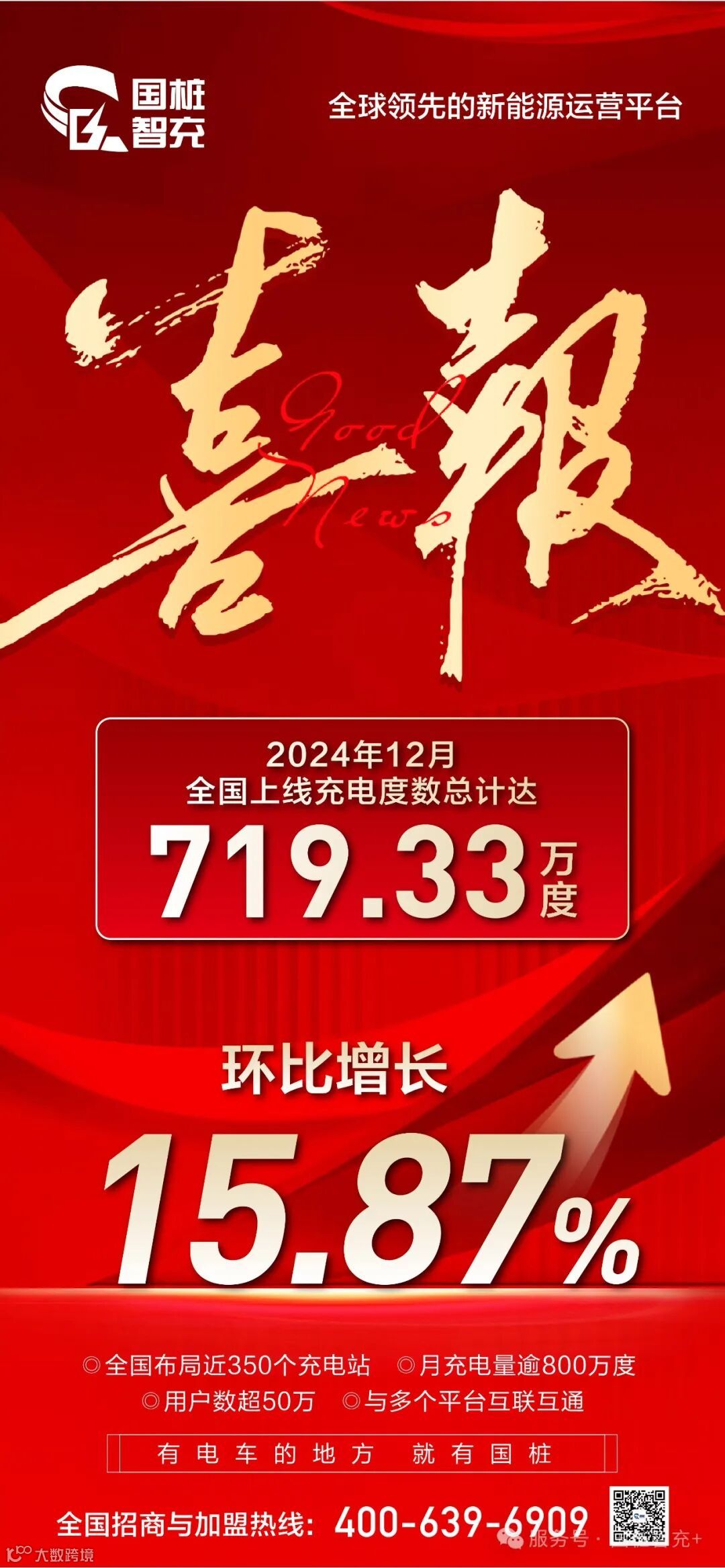 重大喜讯!2024年12月,在全国各地合伙人的共同努力下,国桩智充充电量达到了719.33万度!比上月环比增长了15.87%,创历史新高!为2024年划下了完美的句号。