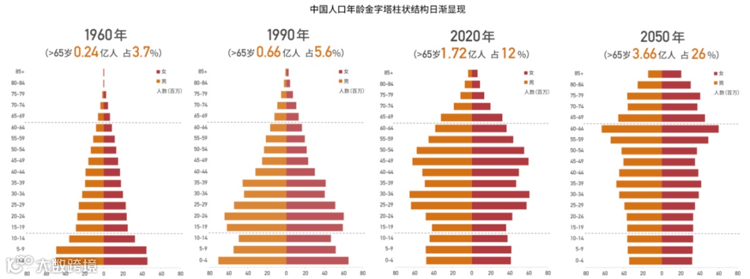 传统农业社会出生率高、存活率低、人均寿命短,形成典型的金字塔结构。到了工业社会,生育率和死亡率降低,人均寿命大为延长,自然就演变成柱状结构;同时中产人群形成和不断壮大,人均寿命的延长也带来老龄化的挑战和机会。