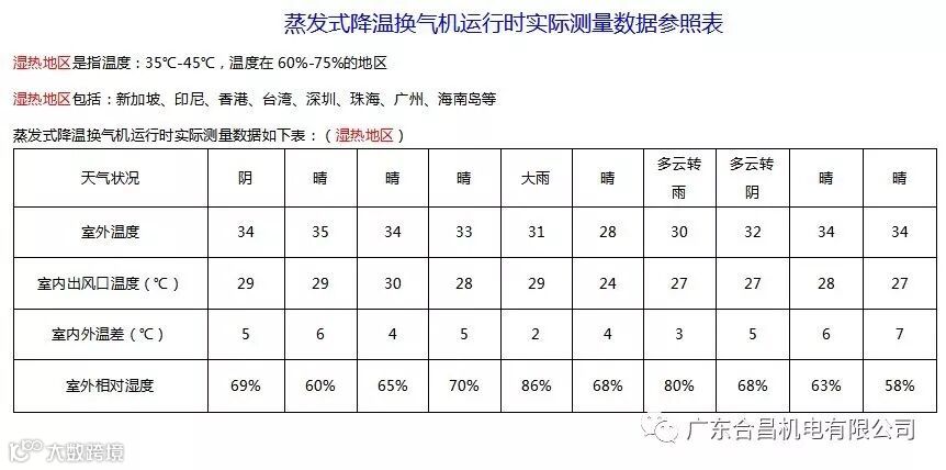 环保空调工程本身的设计安装是根据《蒸发式冷气机》国家标准(GB/25860-2010)为设计依据,所以当工程完工验收降温效果时,会根据国家标准文件的温度下降图表为重要的降温效果数据参考依据,就拿广东深圳这边的一个夏季平均的温湿度环境条件为例(tw=38, 湿球温度:ts=26.8 ,空气相对湿度:φ=53 %,根据上述气象条件,如果按 85%的饱和效率为参考数据,出风口降温效果(与室外空气温差):Δt=(tw-ts)×85%=(36.8-26.8)×85%=9.5℃),因为环保空调设计时多以定点岗位降温方案为主,所以测量温度时无法以整体降温效果为准,都是以环保空调出风口的温度为准,当环境温湿度变化,其出风口的温度测试结果有±1℃的偏差是正常情况。