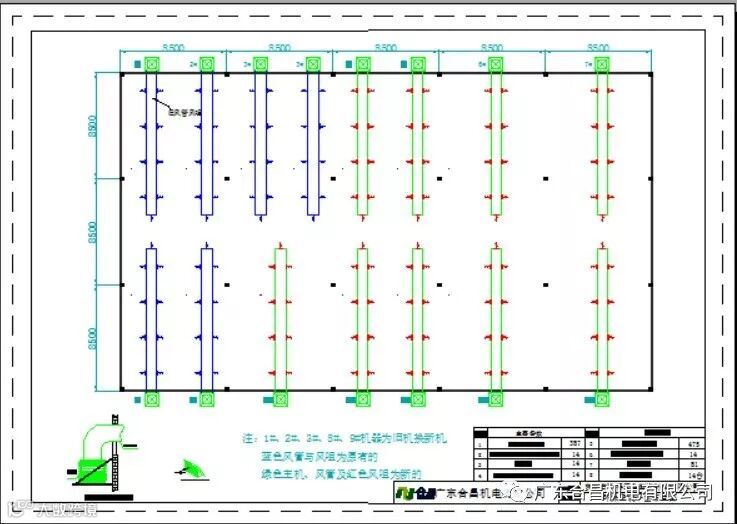广东合昌提供的解决方案:以一楼注塑车间为例,工作区范围面积为1500㎡,根据整体换气及岗位送风为原则,安装广东合昌环保空调23型15台,(每台机的风量为23000m³/h),采用管道的送风方式到车间,然后利用专用风咀定向分布,达到整体通风、不断换气的目的,整个车间的换气次数57次/h。