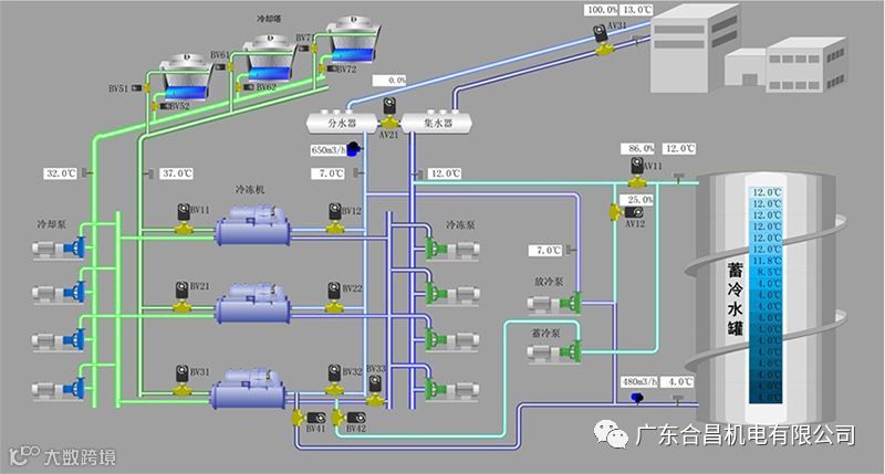 水蓄冷机房的运行策略:全量利用低谷蓄冷,白天蓄冷槽供冷,减少白天高峰时期的用电量,最大限度节省运行费用。