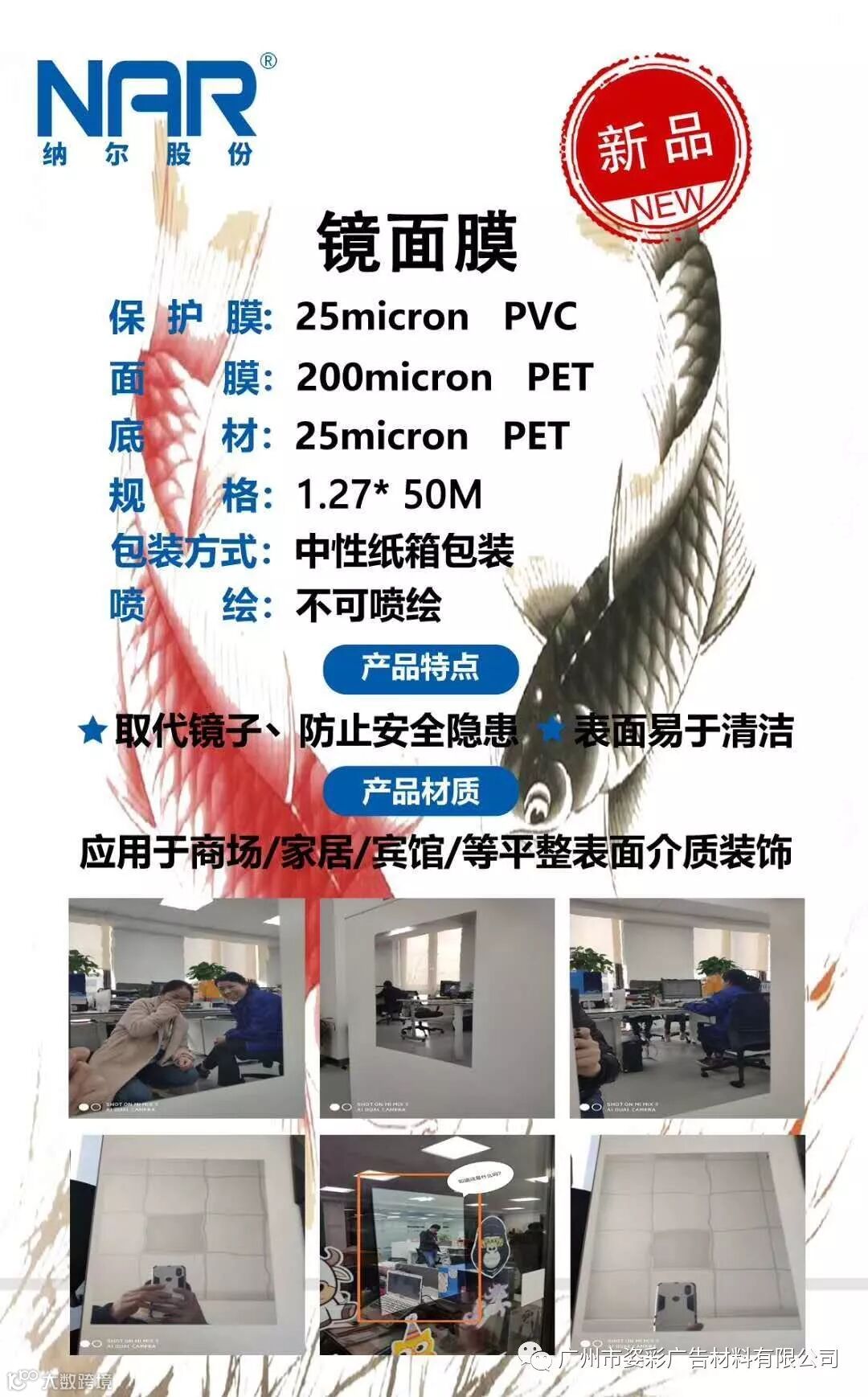 本产品为“镜面膜”面材为PET材质,面材上有一层保护膜,防止面材刮伤,影响镜面效果。底材也是PET材质