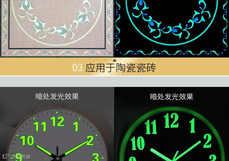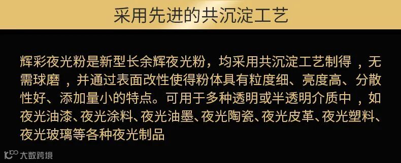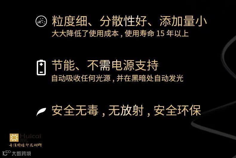 辉彩夜光粉产品均采用共沉淀工艺制得,无需球磨,并通过表面改性使得粉体具有粒度细、亮度高、分散性好、添加量小的特点,大大降低了使用成本,发光时间比普通型夜光粉多10倍以上,耐候性好,户内、户外都可使用。