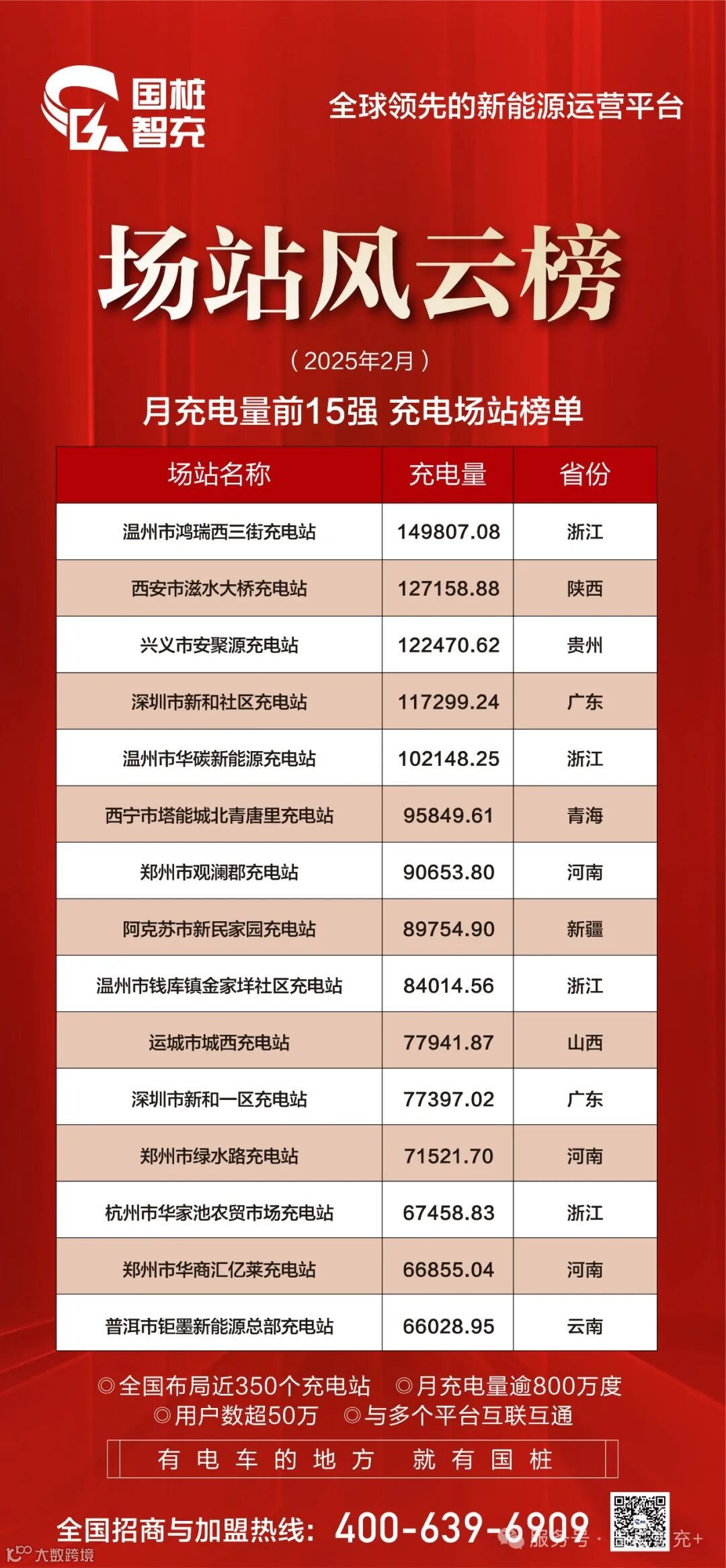 2月充电量位列前五名的场站是:温州市鸿瑞西三街充电站、西安市滋水大桥充电站、兴义市安聚源充电站、深圳市新和社区充电站和温州市华碳新能源充电站。