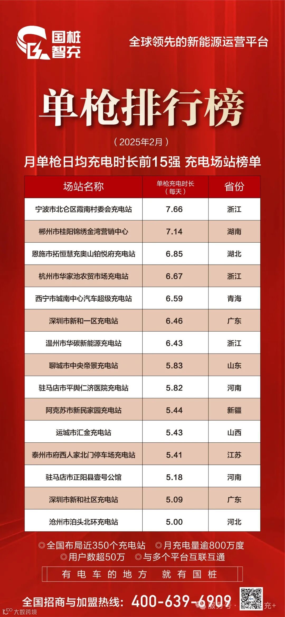 2月份单枪日均充电时长前五名为:宁波市北仑区霞南村委会充电站、郴州市桂阳锦绣金湾营销中心、恩施市拓恒慧充奥山铂悦府充电站、杭州市华家池农贸市场充电站和西宁市城南中心汽车超级充电站。
