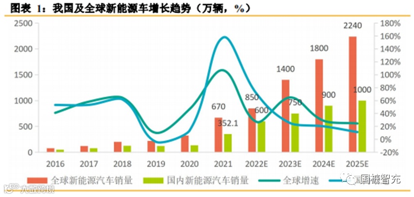汽车产业的电动化浪潮已然来临,电动汽车发展步入高速增长阶段。EVTank数据显示,2021年,全球新能源汽车销量达到670万辆,同比大幅度增长102.4%,全球汽车电动化渗透率也由2015年0.8%增长到2021年的7.74%,预计2022年、2025年全球新能源汽车销量将分别超过850万辆、2200万辆。乘联会数据显示,9月新能源汽车零售渗透率达到31.8%,预计2022年、2025年我国新能源汽车销量将超过600万辆、1000万辆。
