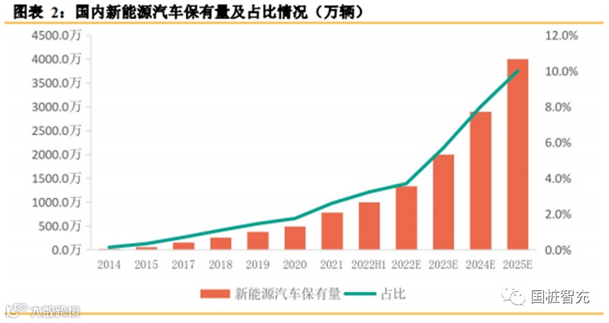 截止2022年9月底,新能源汽车保有量达1149万辆,前三季度新注册登记371.3万辆。2022年前三季度,全国新注册登记新能源汽车371.3万辆,同比增加184.2万辆,增长98.48%。预计到2025年国内新能源汽车保有量将达到4000万辆,保有量占比将达到10%。
