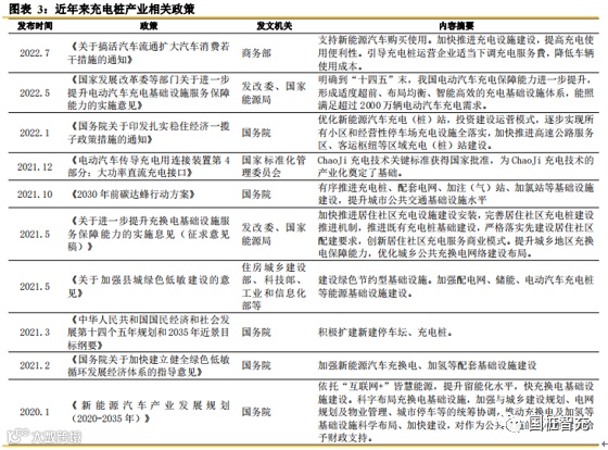 近年来,在充电桩行业快速发展的同时,仍然存在居住社区建桩难、公共充电设施发展不均衡、用户充电体验有待提升等突出问题。在这一背景下,国家陆续出台了相关政策支持充电桩相关技术、模式和机制创新,在解决新能源充电桩发展问题的同时,构建新型电力系统,完善相关基础设施,助力“双碳”目标实现。2020年5月国务院发布《2020年政府工作报告》,首次提出“新基建”(新型基础设施建设)概念,将充电基础设施作为七大基础设施之一,纳入“新基建”。2021年中央经济工作会议指出,当前经济面临需求收缩、供给冲击、预期转弱三重压力,应坚持稳字当头,强化政策发力,充电桩作为新基建组成之一,在稳增长主线下,建设节奏或将加速。2022年1月,国家发展改革委、国家能源局等出台《国家发展改革委等部门关于进一步提升电动汽车充电基础设施服务保障能力的实施意见》(发改能源规〔2022〕53号),提出到“十四五”末,我国电动汽车充电保障能力进一步提升,形成适度超前、布局均衡、智能高效的充电基础设施体系,能够满足超过2,000万辆电动汽车充电需求。多项政策落地,使得我国新能源充电桩行业的发展方向和发展目标逐渐清晰,为行业发展提供有益土壤。