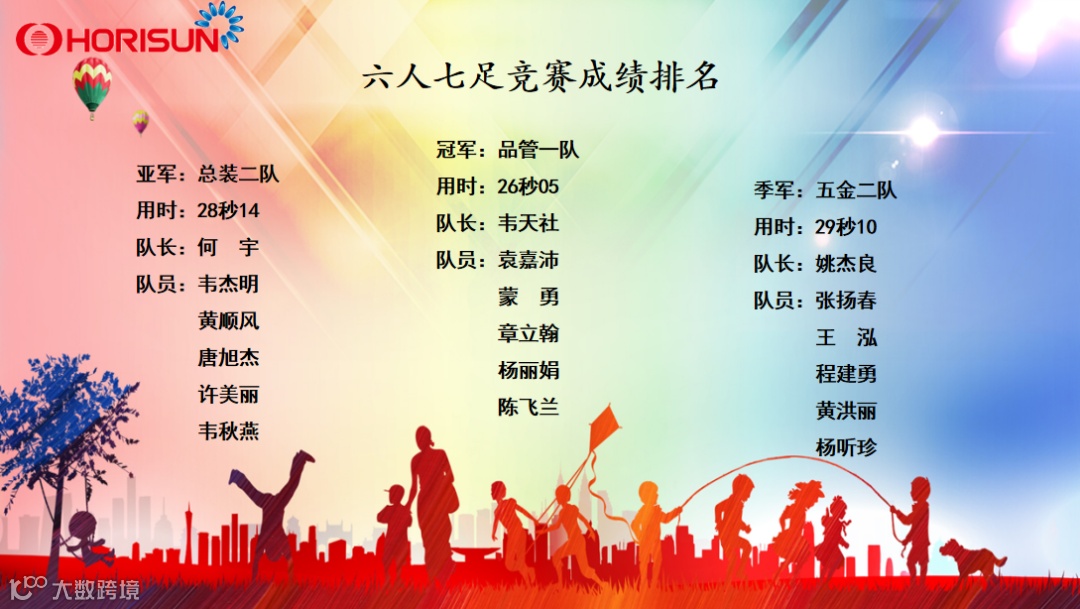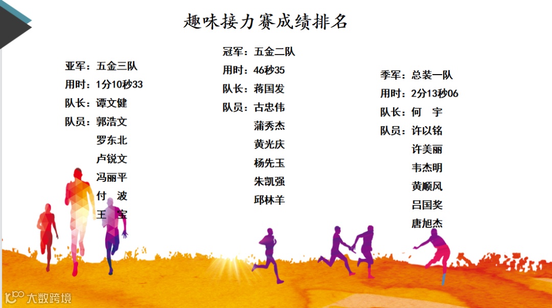 本次趣味运动赛项目分别有六人七足、趣味接力赛、一圈到底(传递呼啦圈),共用时1.5小时。