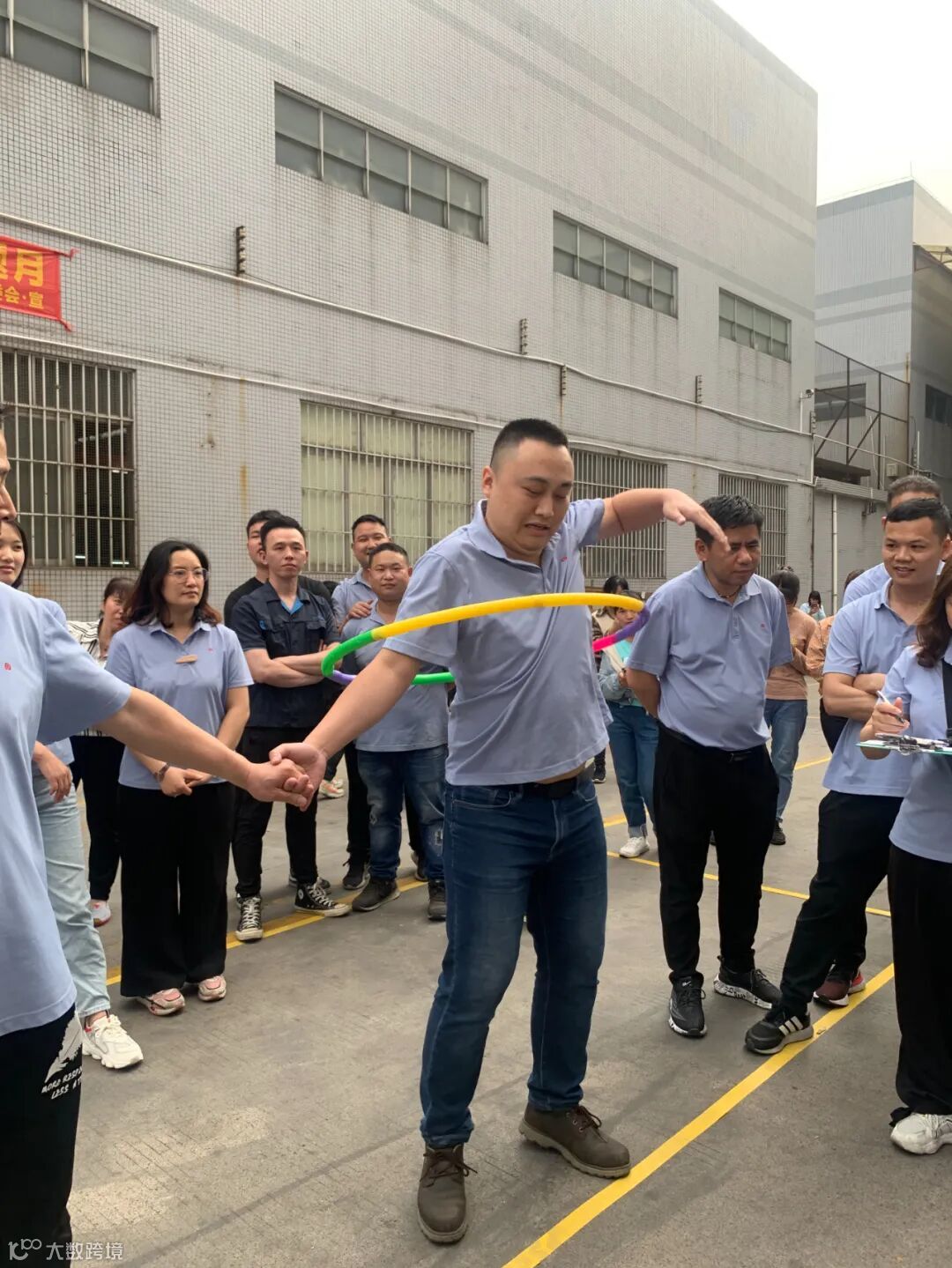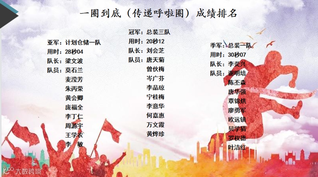 第三项进行的是一圈到底(传递呼啦圈):每队10人,比赛结果以完成呼啦圈传递一轮的时间长短竞选前3名队伍。