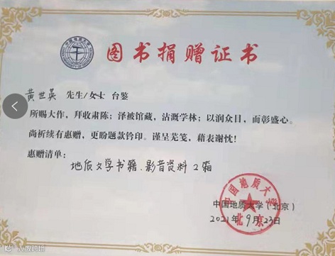 中国地质大学十分重视黄世英先生的捐赠,校党委书记马俊杰要求校党委宣传部领导多次与黄先生联系办理捐赠交接有关事宜,颁发中国地质大学“图书捐赠证书”及赠送纪念品。