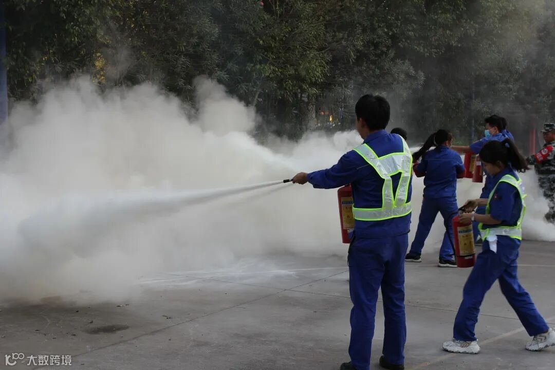 (员工佩戴防毒面具,实操灭火器等消防器材。)