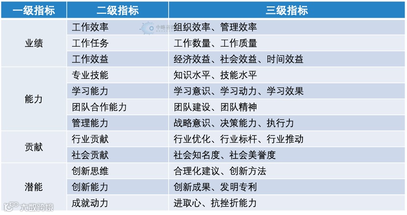 第一是业绩。业绩考核需基于人才所从事的工作,客观地反映人才的工作成果和表现。作为多层次和多维度的指标体系,业绩一般包括工作效率、工作任务和工作效益三个维度。