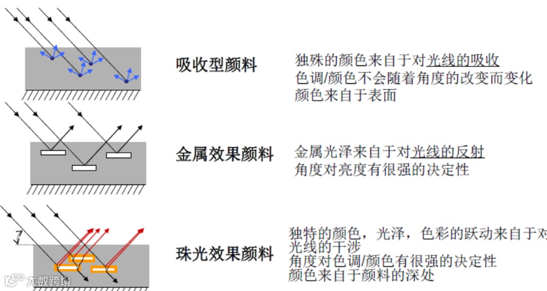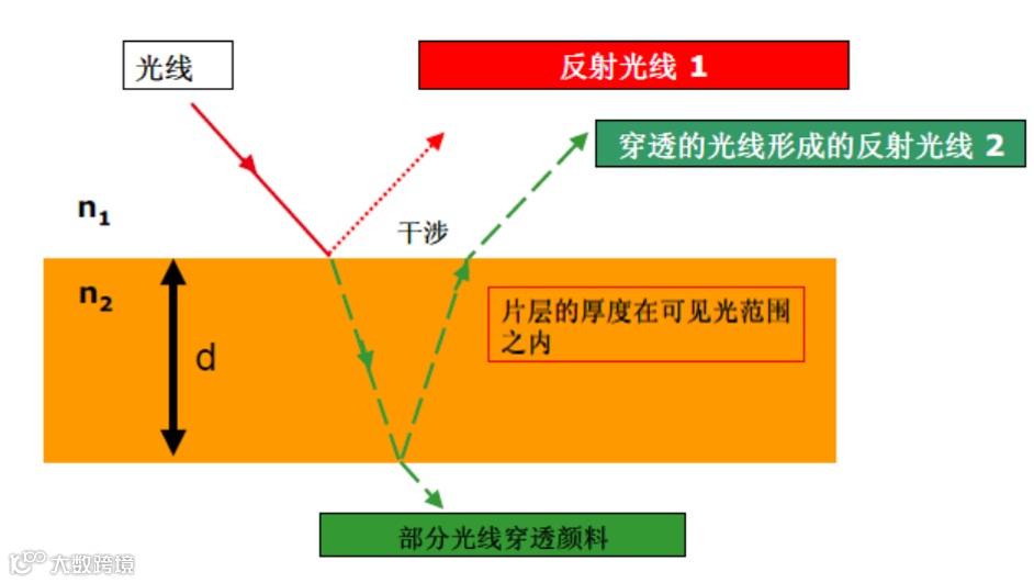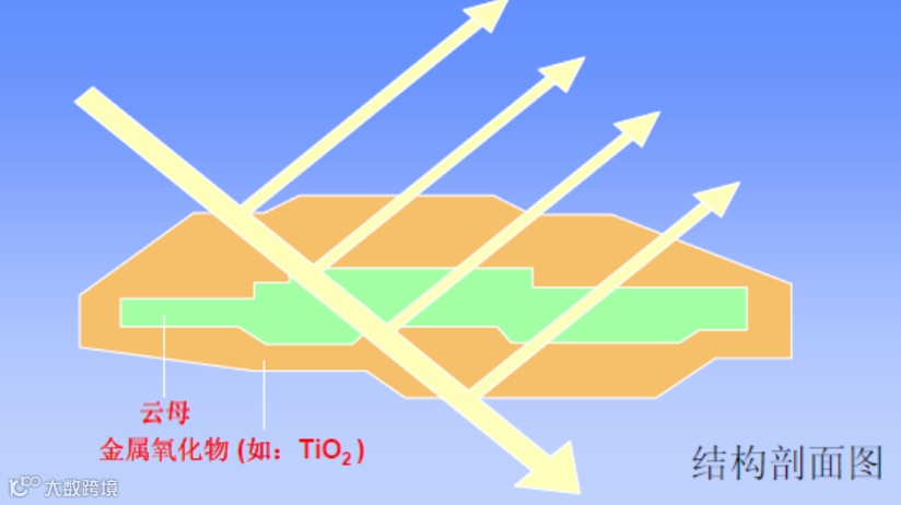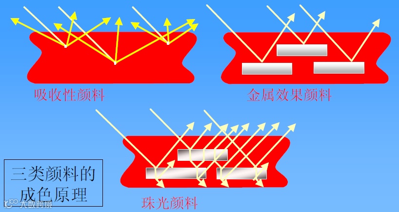 珠光颜料的颜色是靠复杂反射外部光线来表达的,这是从结构的角度来演示各种颜料的显色原理。