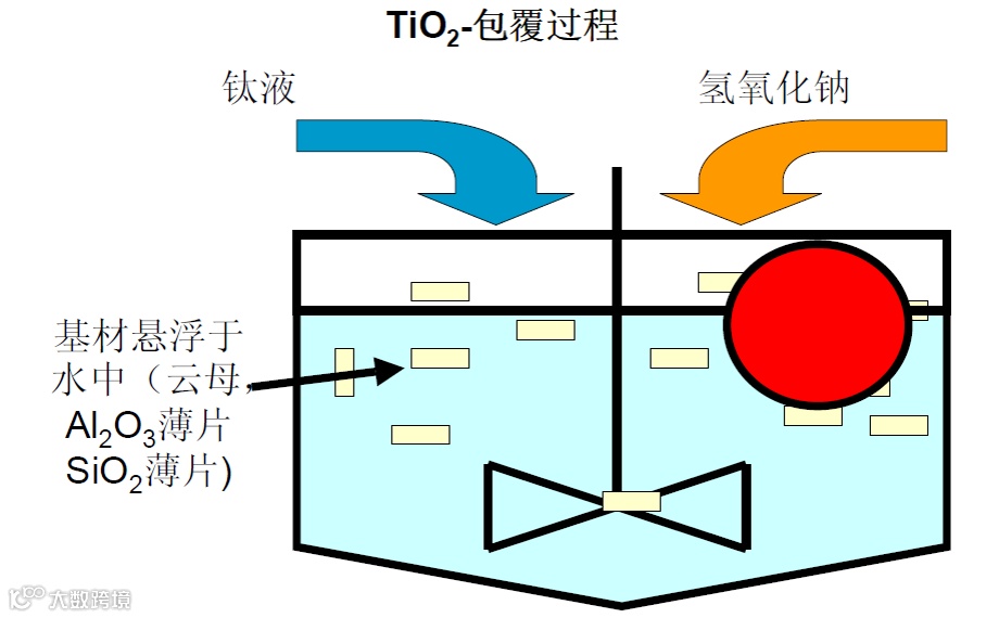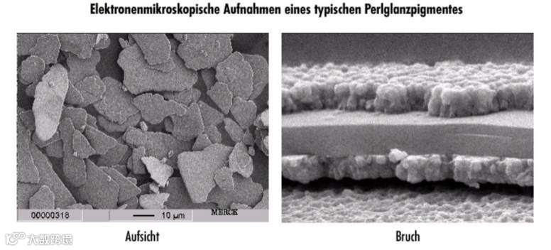 珍珠及金属光泽效果颜料,呈片状,由天然云母包覆二氧化钛或三氧化二铁(其他氧化物)。依靠平滑的表面对光线进行反射,同时依靠高透明性对光线进行折射及再反射。由于存在光程差,前后折射光之间会产生干涉并形成新的色泽。通过控制金属氧化物包覆层的厚度来得到不同的干涉颜色。