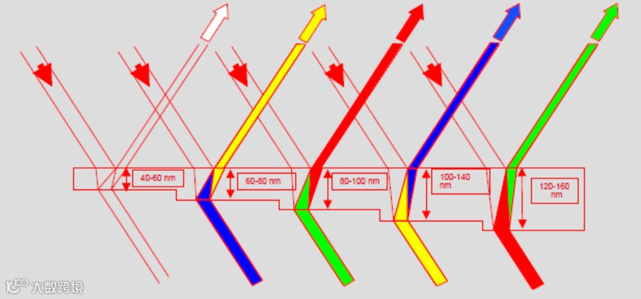 如图所示,随着包覆厚度的增加,珠光颜料所表达的颜色依次是银色,浅金色,淡红色,紫色,蓝色,绿色。几乎所有的化学法合成的珠光颜料都是这个颜色的趋势走向。