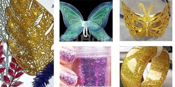 金葱粉可通过注塑,丝印,涂层,喷撒的主式,用于纸,布,木,金属,皮具,塑胶,陶瓷等多种材料上,形成装饰或反光等特殊或醒目的效果。